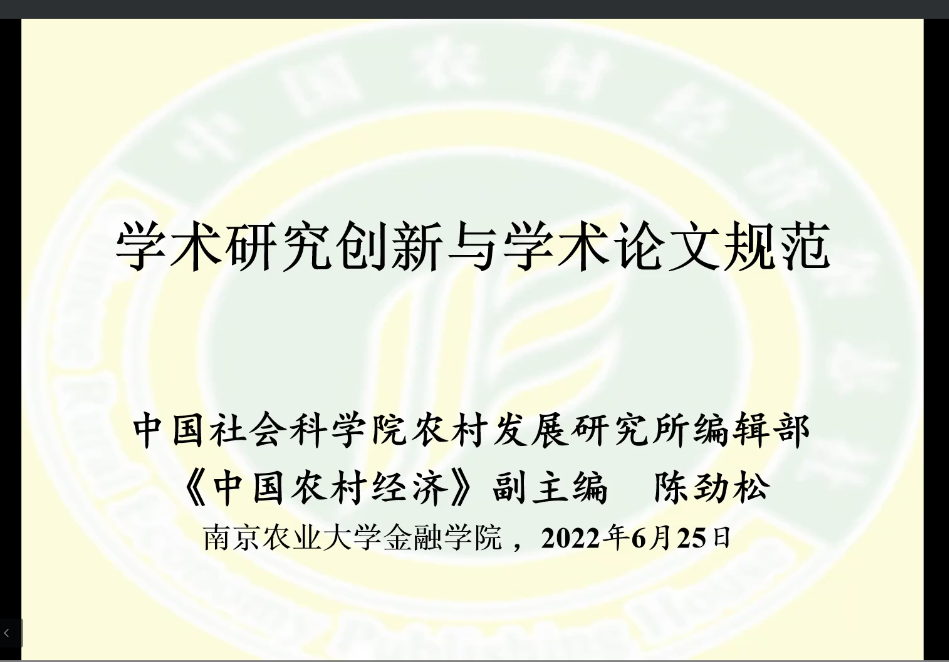 2022年6月25日上午,中国社会科学院农村发展研究所编辑部、《中国农村经济》副主编陈劲松研究员受邀做题为“学术研究创新与学术论文规范”的学术报告。报告由bv1946伟德官网副院长张龙耀教授主持,bv1946伟德官网百余名师生参加。