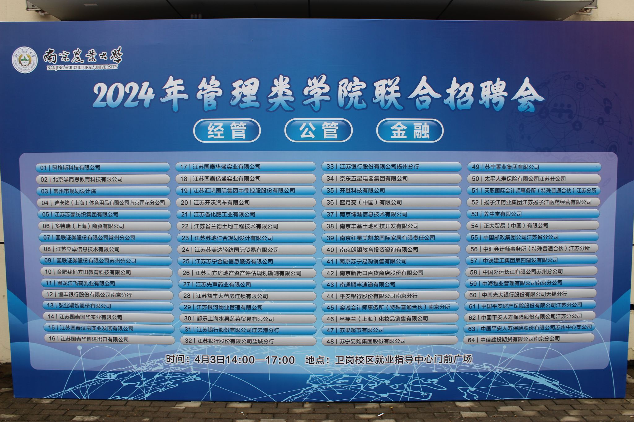 2024年4月3日,伟德bv1946官方网站2024年管理类学院联合招聘会在卫岗校区校友山广场顺利举办。此次招聘会由bv1946伟德官网与经济管理学院、公共管理学院联合举办。