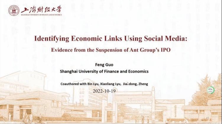 2022年10月19日上午,上海财经大学公共经济与管理学院投资系副教授、博士生导师、北京大学数字金融研究中心特约高级研究员郭峰老师受邀为我们做题为“Identifying Economic Links Using Social Media”的学术报告。报告由bv1946伟德官网院长张龙耀教授主持,140余名师生参加了此次讲座。