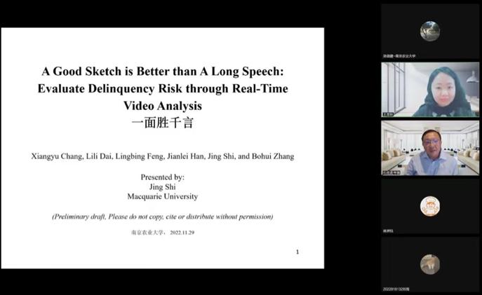 2022年11月29日下午,澳大利亚麦考瑞大学商学院金融学教授石劲为我们做题为“A Good Sketch is Better than A Long Speech: Evaluate Delinquency Risk through Real-Time Video Analysis”的学术报告。报告由bv1946伟德官网副院长王翌秋教授主持,百余名师生参加了此次讲座。