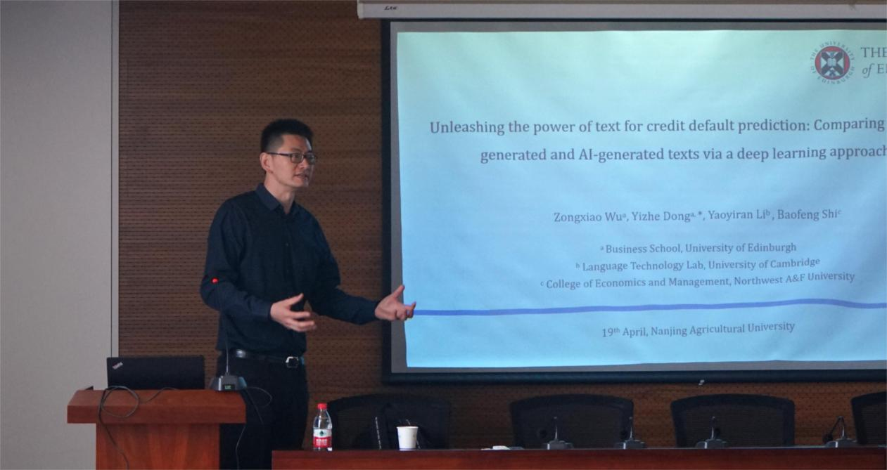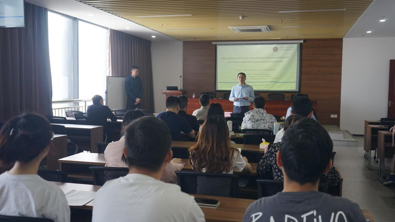 4月19日上午,英国爱丁堡大学副教授、博士生导师董轶哲受邀为我们做题为“Unleashing the power of text for credit default prediction: Comparing human-generated and AI-generated texts via a deep learning approach”的学术报告。报告由金融系主任彭澎副教授主持,学院近百名师生参加。