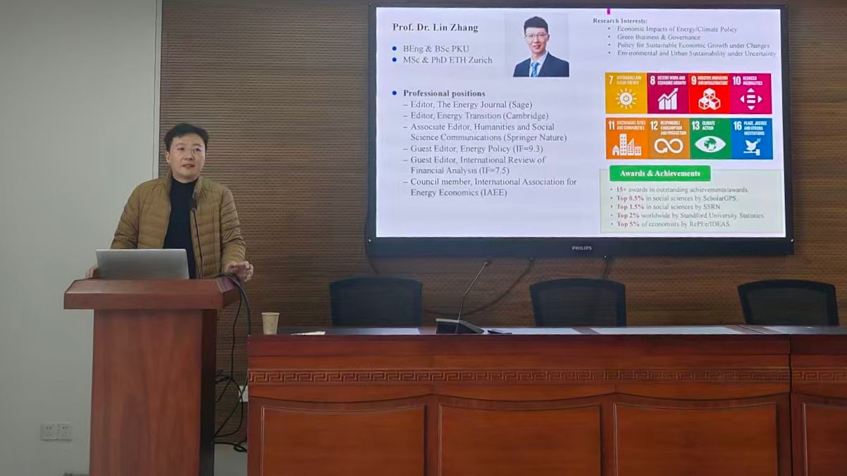 郭萌萌教授首先向与会师生介绍了应邀前来的张林教授,并对张林教授的到访表示诚挚的欢迎。张林博士为香港城市大学教授,全球治理与创新研究院副院长,博士生导师,同时是国际能源经济学会(IAEE)理事、美国国务院经济与可持续发展SUSI访问学者、香港清洁能源研究院研究员。曾任瑞士苏黎世联邦理工经济研究中心高级研究员,瑞士能源研究中心顾问研究员,瑞银国际社会经济学中心研究员。The Energy Journal主编、Energy Policy特邀执行主编。